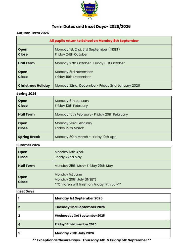 Please see below our term dates and planned INSET days for this academic year.